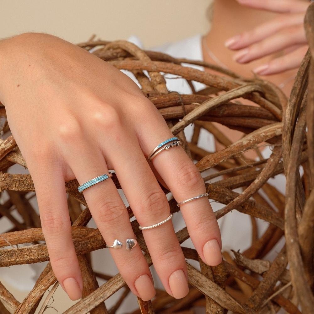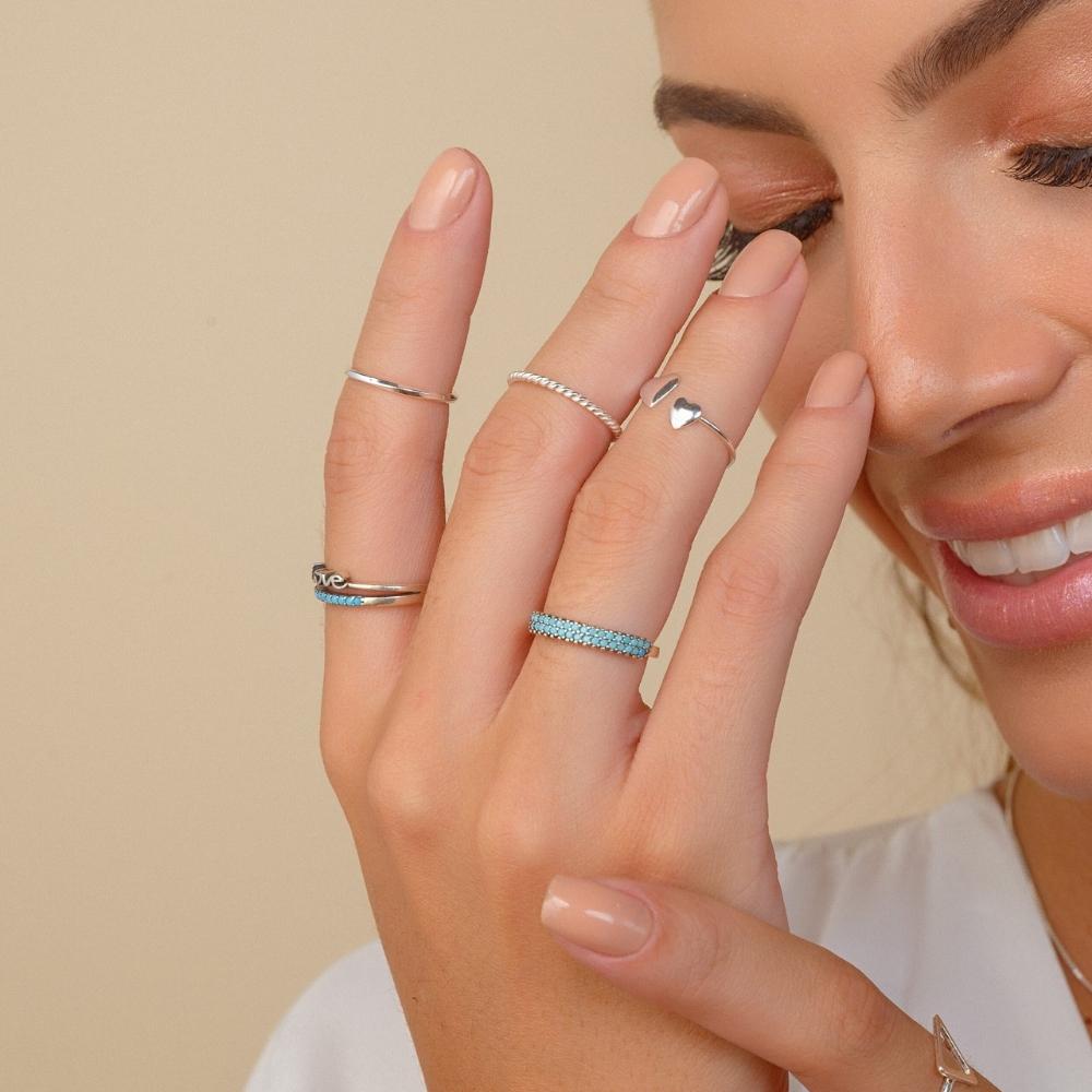 O anel de prata aro duplo love azul turquesa, sem dúvidas é o acessório ideal para embelezar suas mãos e trazer muito charme para qualquer look.