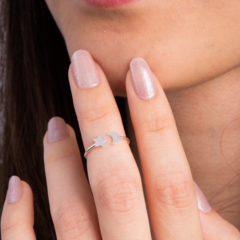 Em uma ponta, tem uma estrela e na outra uma lua. Além disso, é um anel ajustável, o que traz muito conforto e versatilidade durante o uso!