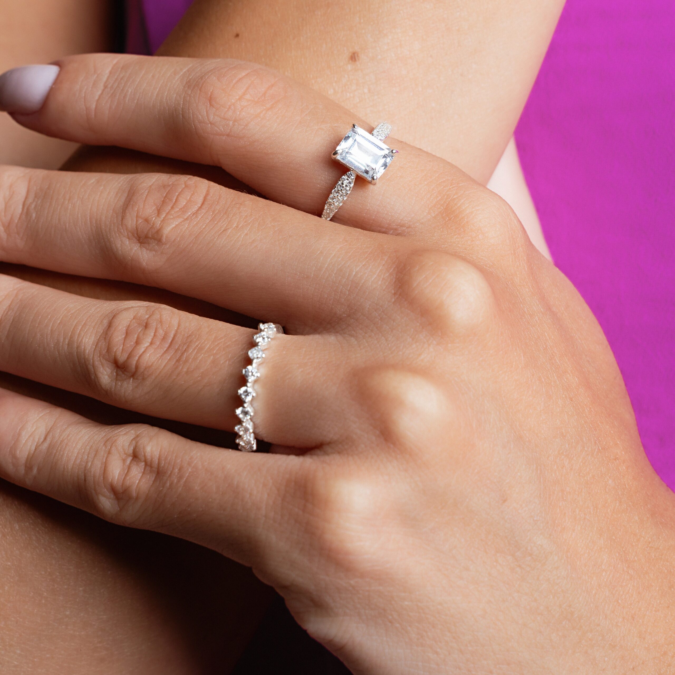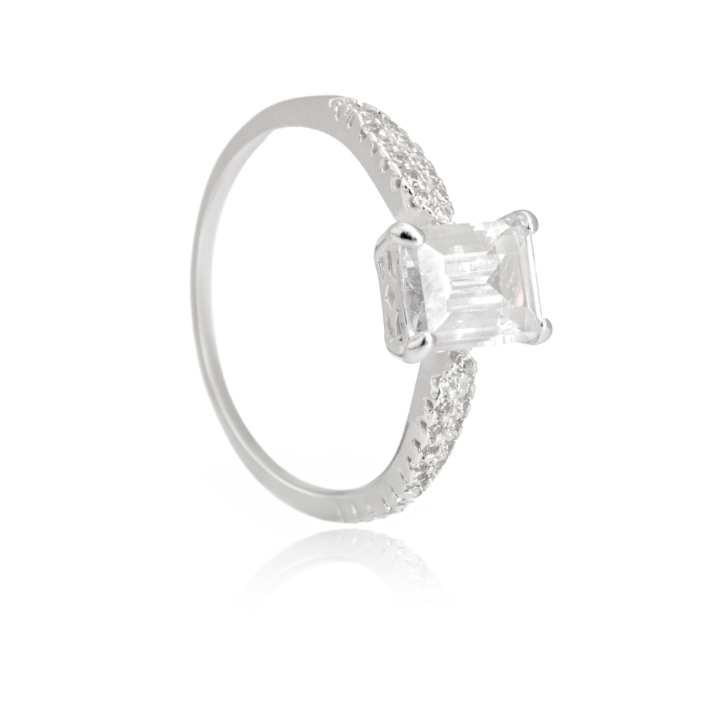 O Anel de Prata Zircônia Retangular é uma peça sofisticada e cheia de brilho. Feito em prata, possui a parte superior do aro cravejada com micro zircônias e, no topo, uma zircônia retangular cristal que destaca a beleza da joia.