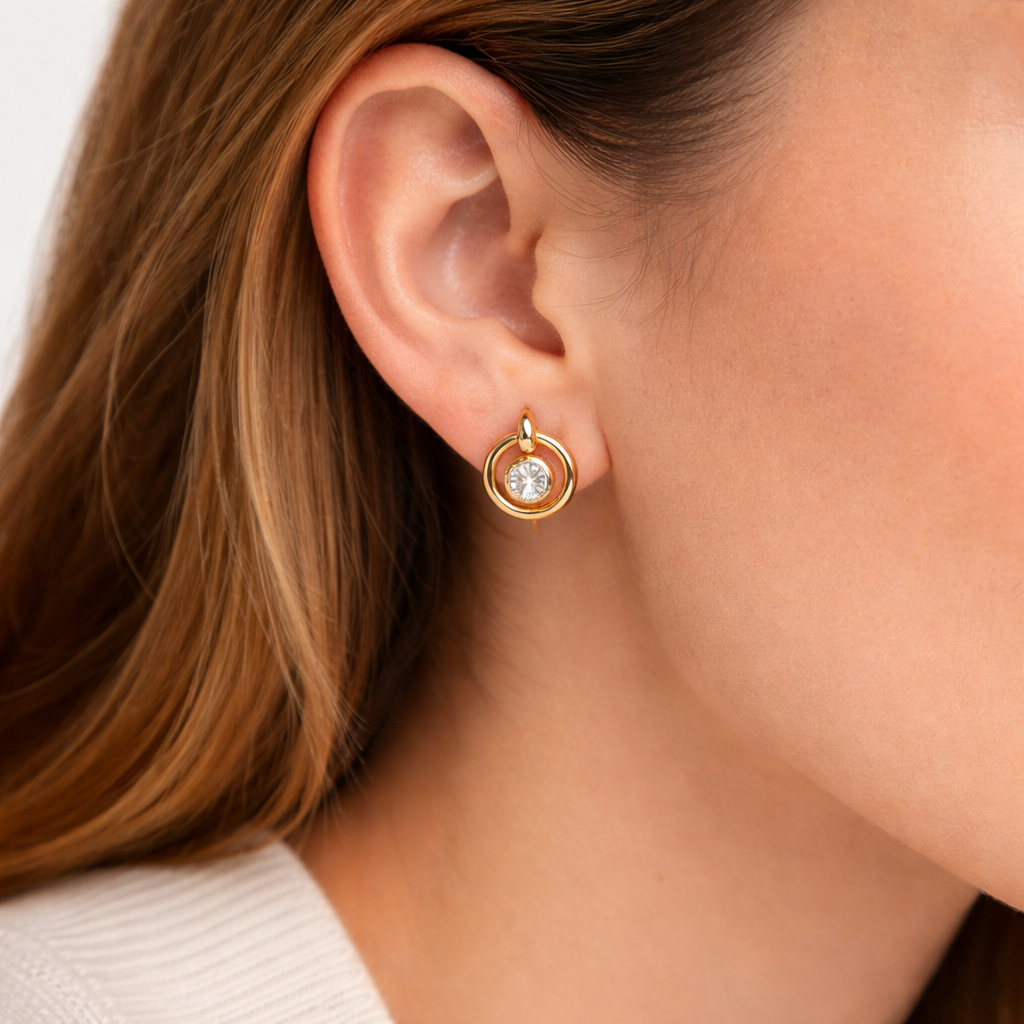 O design delicado dos brincos banhados a ouro 18k valoriza o rosto com leveza e brilho suave, ideal para composições versáteis no dia a dia.