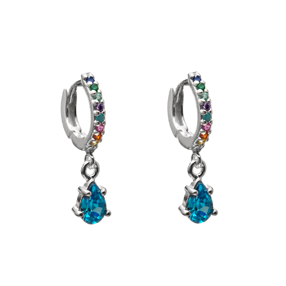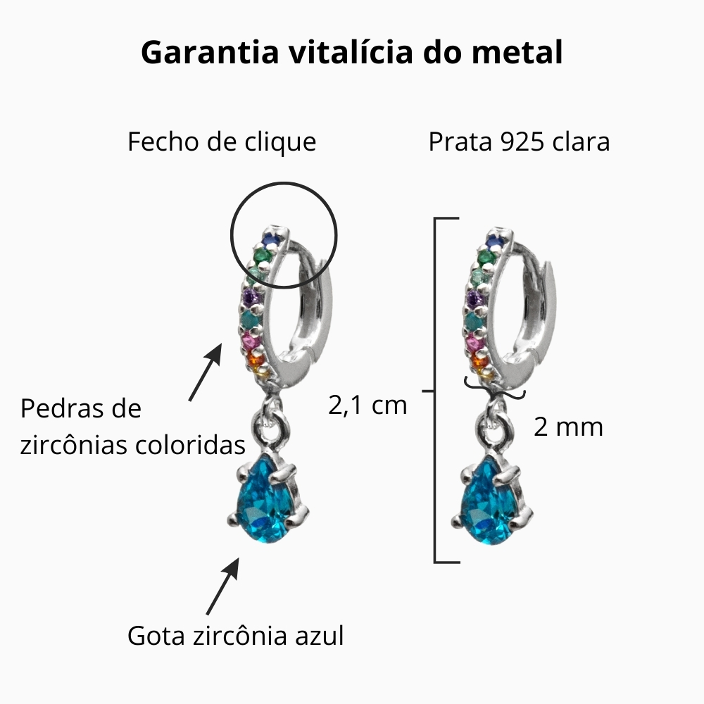As pedrinhas de zircônias coloridas na argola dão um toque especial na joia. Enquanto o pingente com design de gota a torna única!