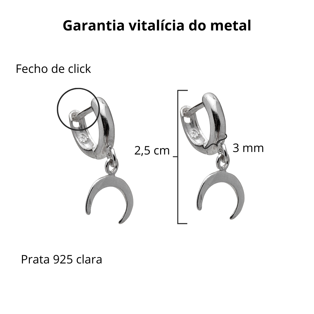 Possui o fecho de clic com um tamanho sutil. Certamente o brinco de argola com pingente lua vai te encantar!