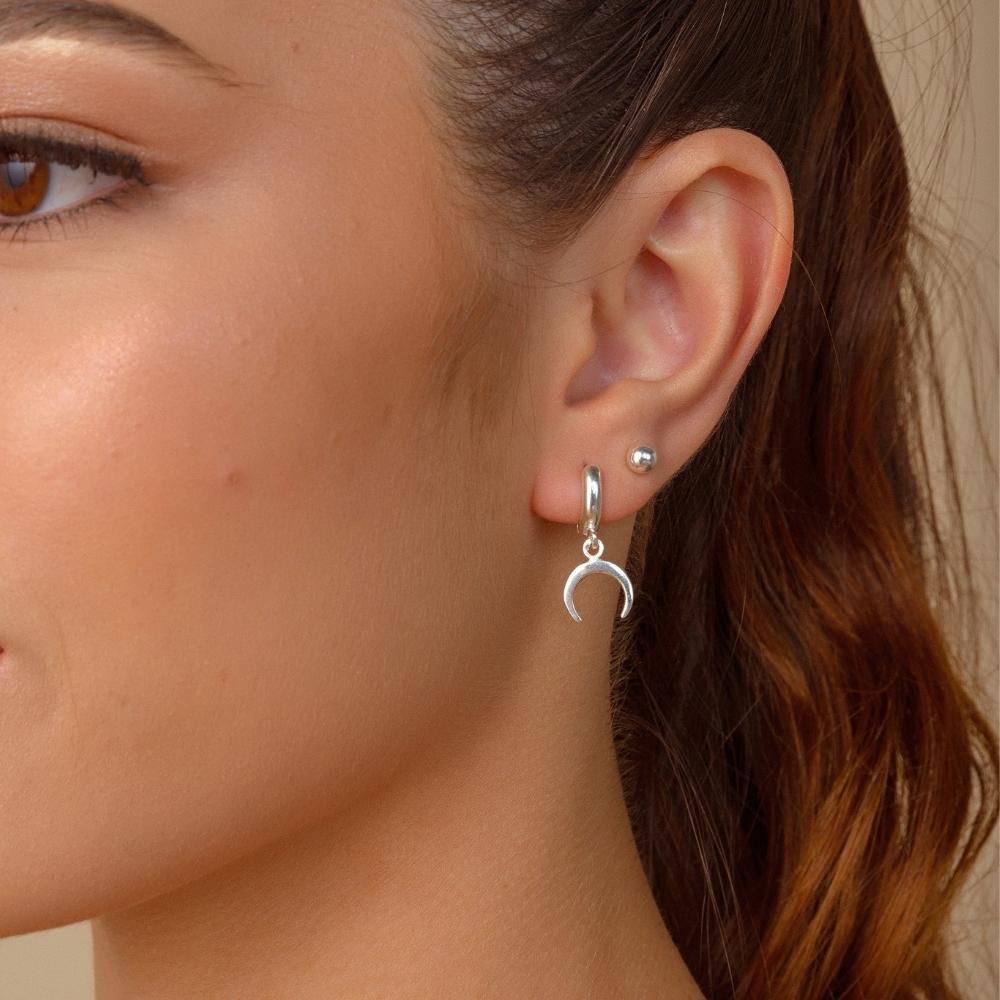 Feito em prata clara, possui um design delicado de argola com um pingente de lua pendurado.