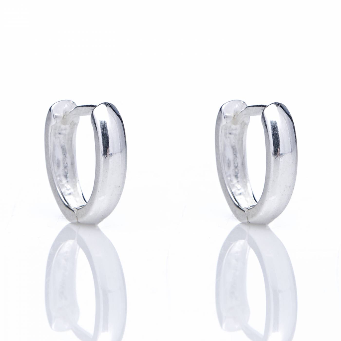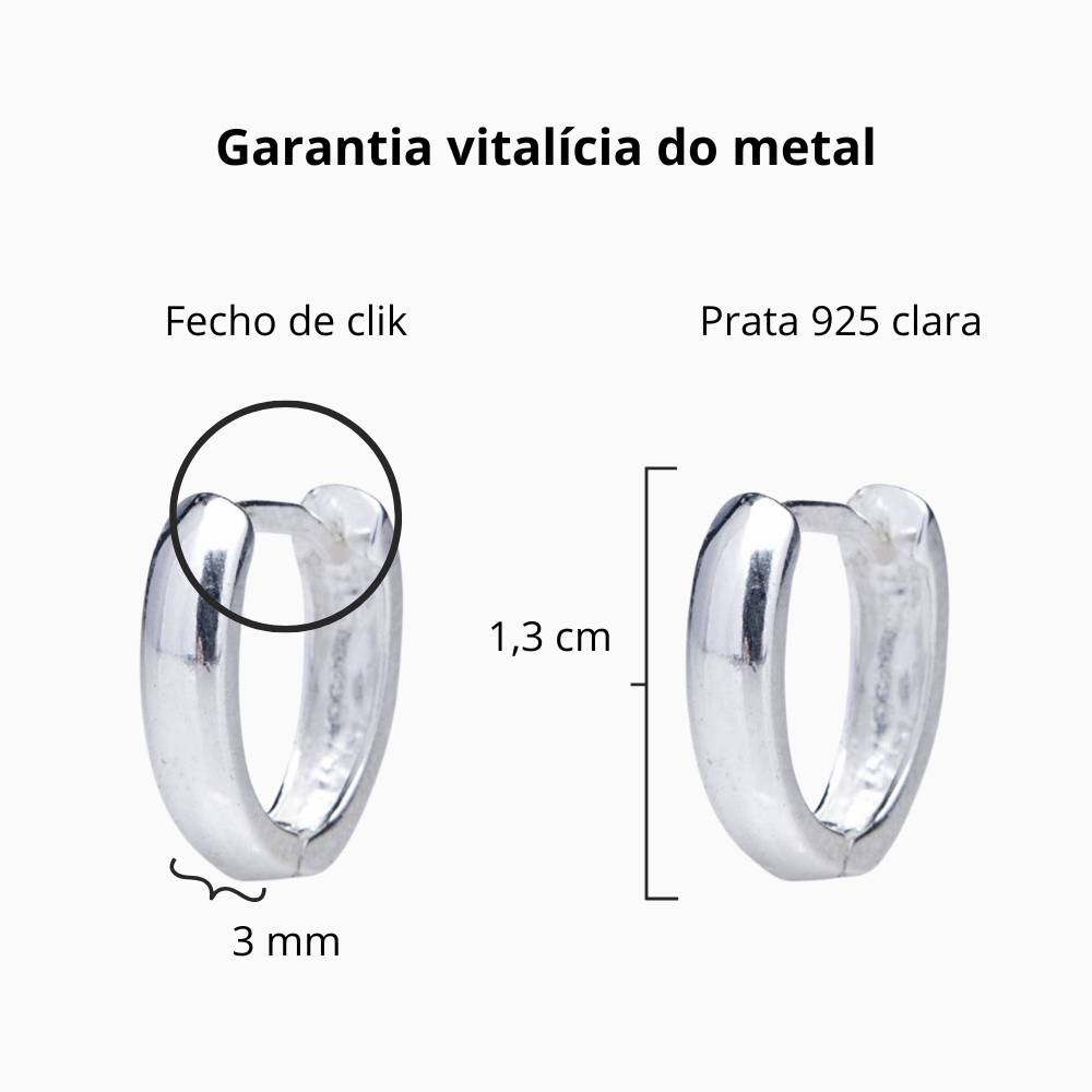 Confeccionado em Prata clara lisa, a argola possui um formato oval e o fecho de clic.