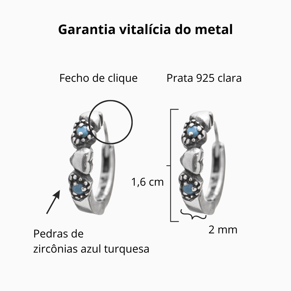Além de todo charme e delicadeza, o brinco corações e zircônias turquesa Prata ainda possui o fecho de clic, que é super prático!