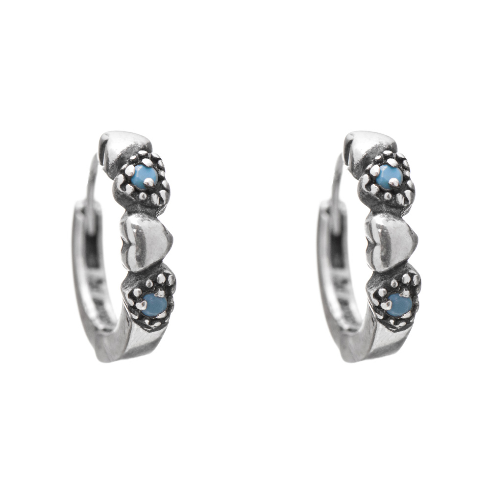 Brinco de prata 925 argolinha mini com corações e zircônias azul turquesa 1,1 cm