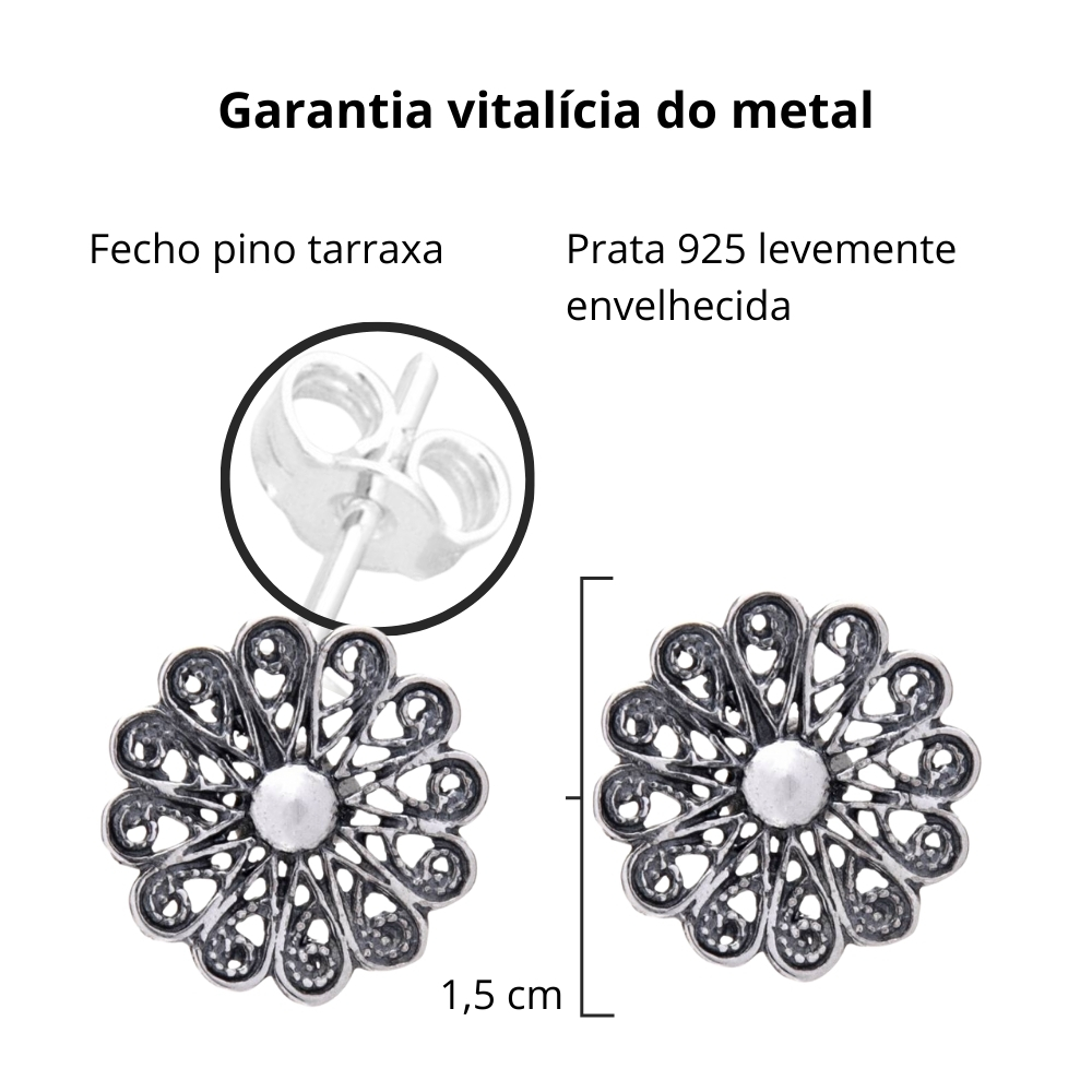 Brinco de prata 925 flor vazada envelhecida 1,5 cm