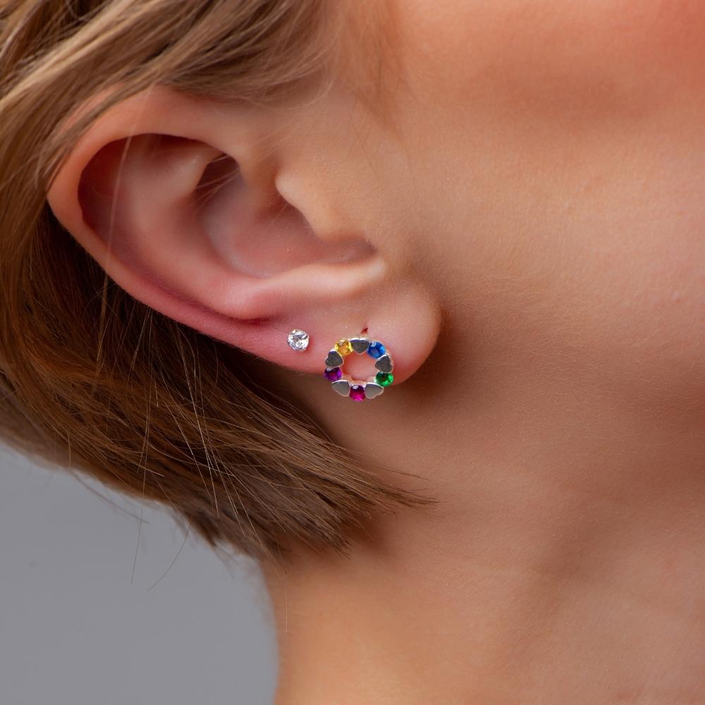 Brinco de prata 925 redondo com corações e zircônias coloridas 1 cm