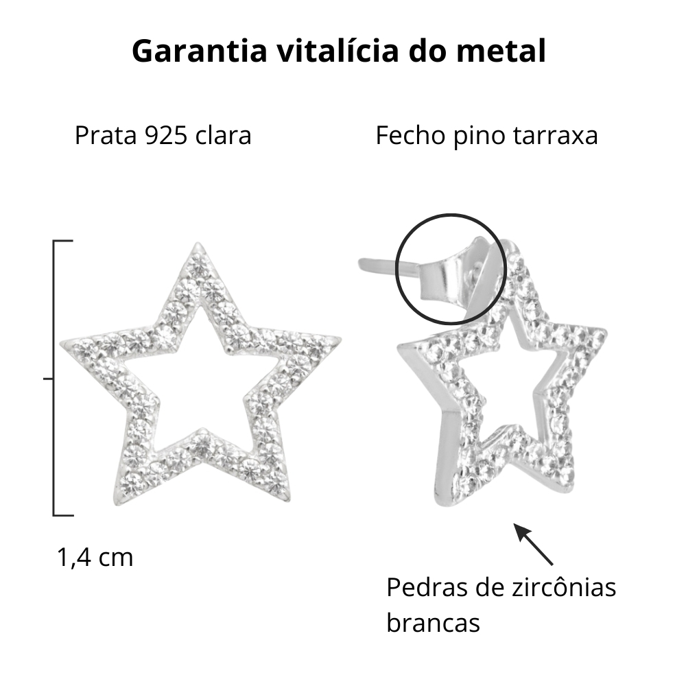 R$ 43,80 5x de R$ 8,76 s/ juros R$ 41,61 no PIXBrinco de prata 925 estrela cravejado com zircônias branca 1,1 cm