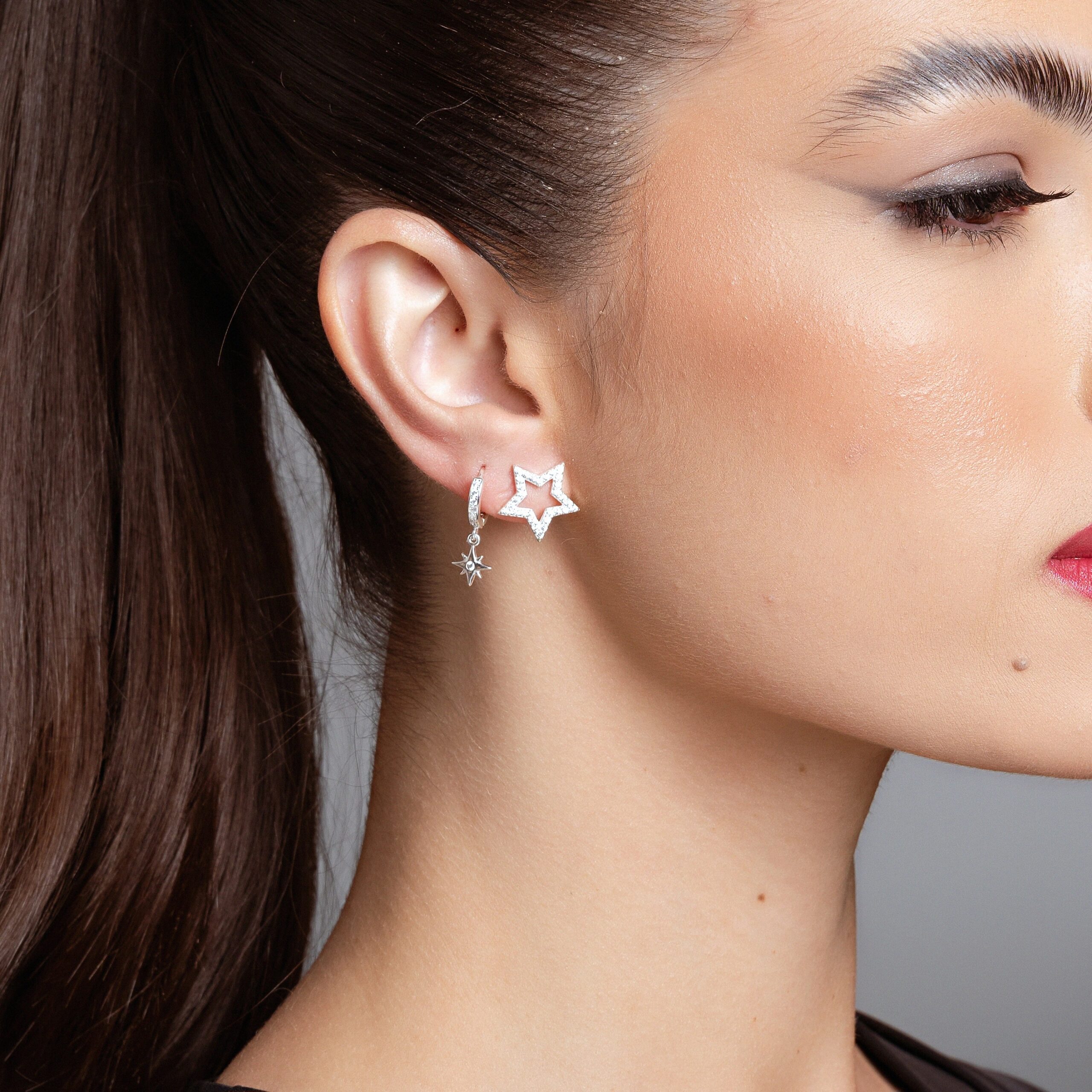 O Brinco de Prata Estrela Vazada Cravejada é uma peça encantadora. Feito em prata, possui um design de estrela vazada, cravejada com delicadas zircônias que adicionam um brilho especial.