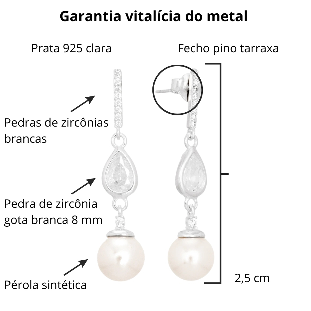Logo abaixo, uma zircônia em formato de gota e uma pérola sintética pendurada adicionam um toque clássico e elegante. Perfeito para casamentos, formaturas e momentos que pedem um brilho extra.