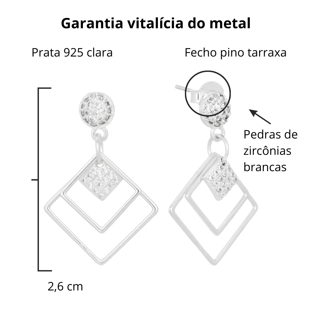 Nossos brincos são produzidos com a Prata 925, que é uma liga composta por 92,5% de prata pura e 7,5% de outros metais, também conhecida como Prata Legítima, essa composição torna a joia mais resistente ao desgaste do dia a dia.