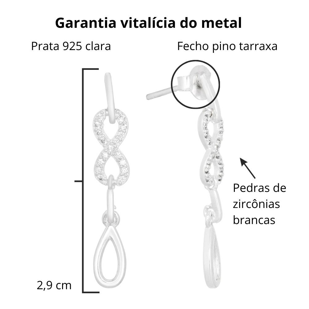 Brinco de prata 925 infinito cravejado e gota vazada lisa