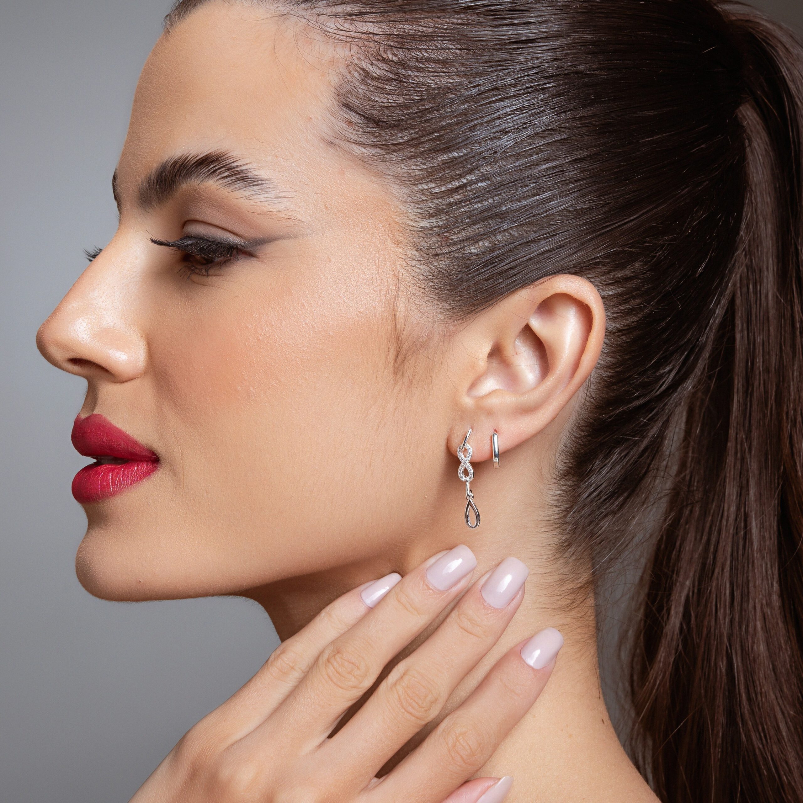 O Brinco de Prata Pendurado Infinito Cravejado é uma joia que combina delicadeza e sofisticação. Pendurado na base, um símbolo de infinito cravejado com zircônias, traz um toque de glamour.
