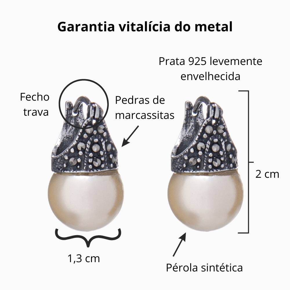 Confeccionado em prata envelhecida, possui detalhes incríveis com pedras de marcassitas e uma linda pérola, que representa a feminilidade, criatividade e pureza.