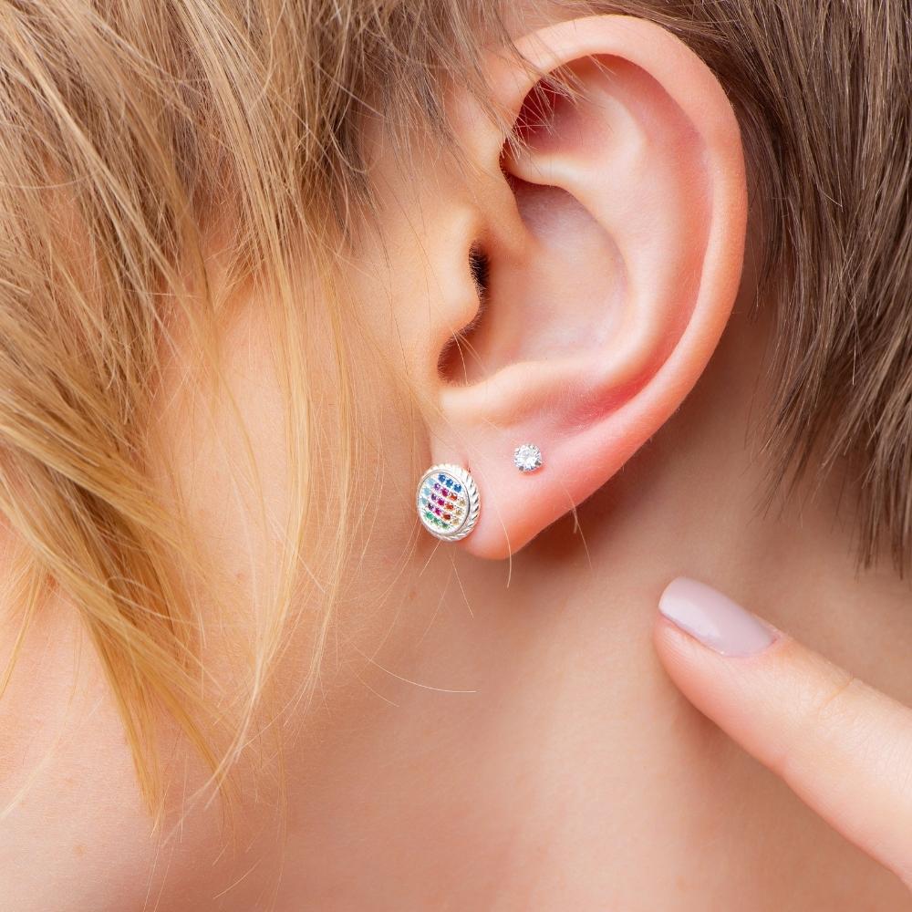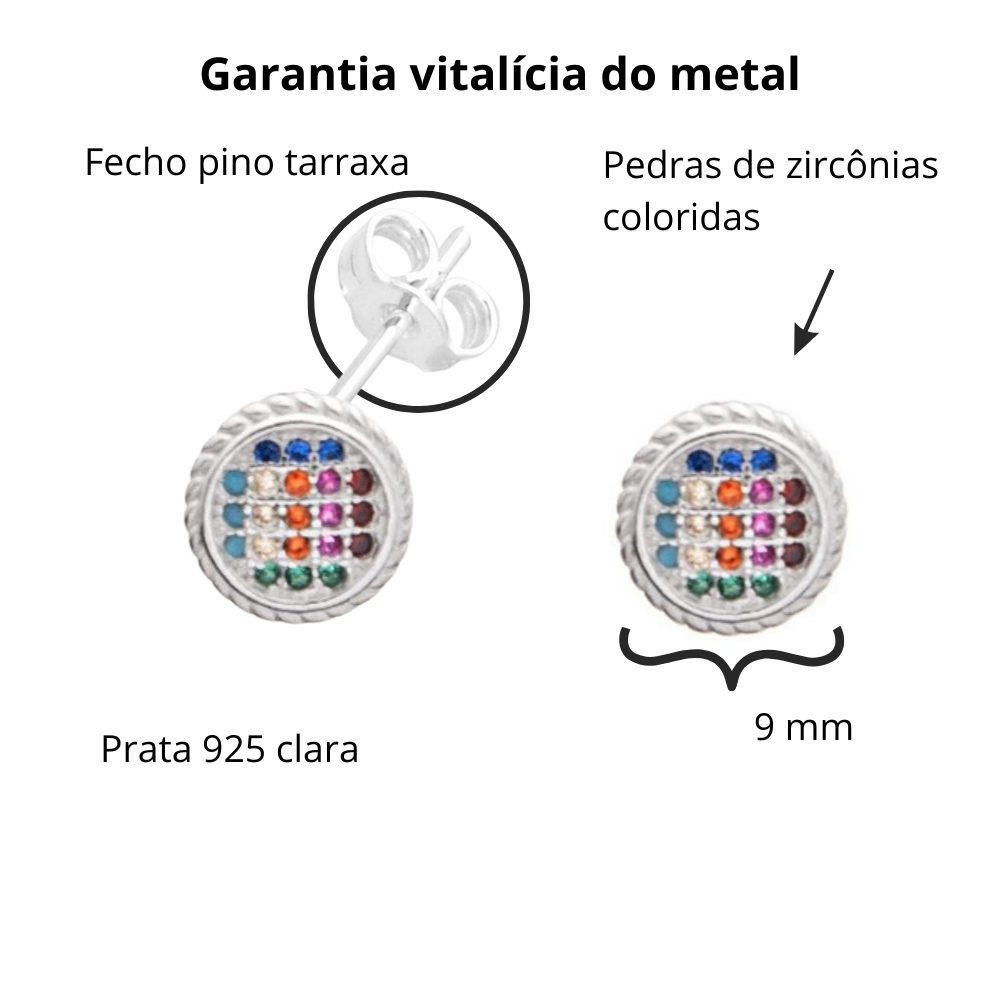 Brinco de prata 925 redondo zircônias coloridas 9 mm