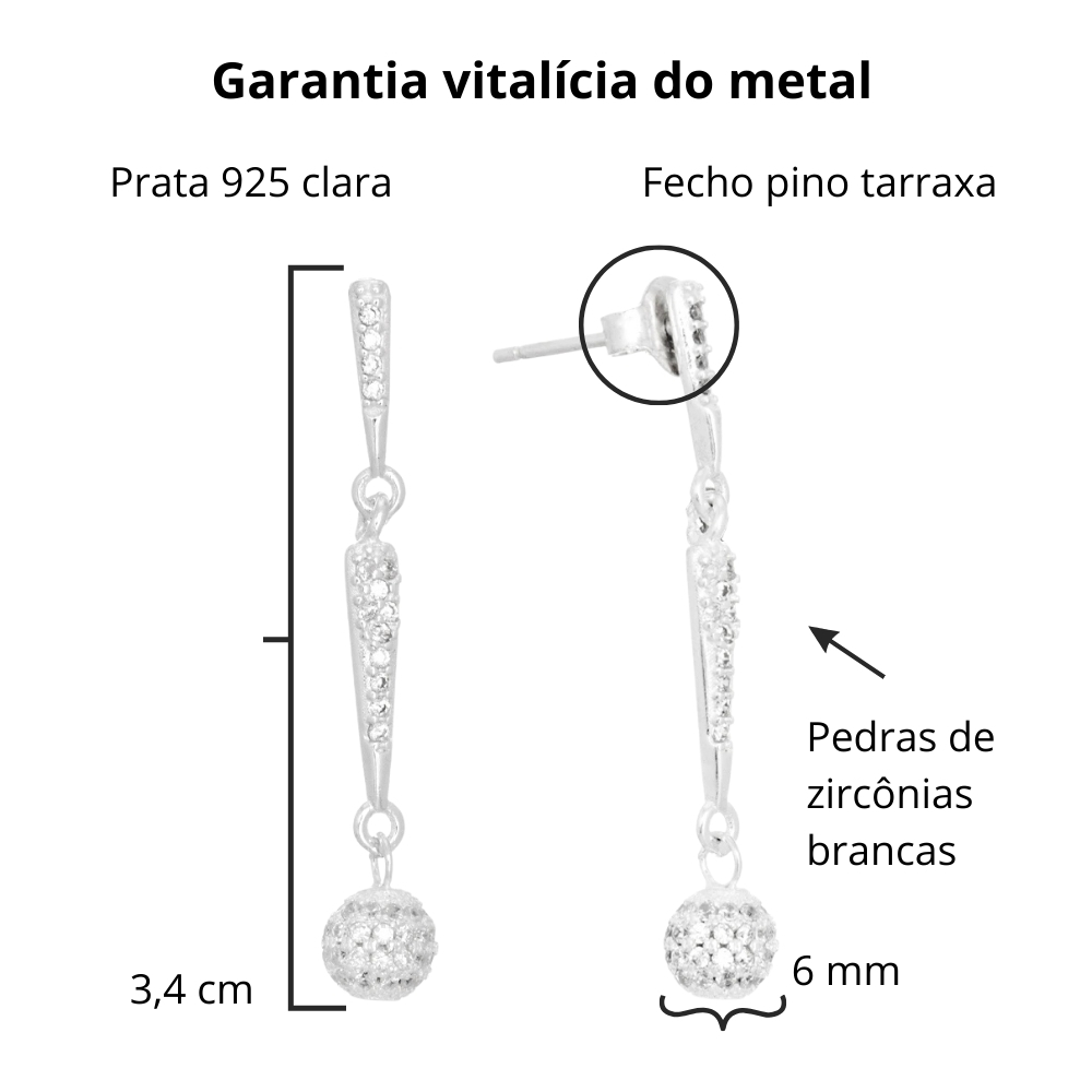 Ele tem dois palitos cravejados e articulados, o que traz muita fluidez e leveza para o visual. Na ponta, uma delicada bolinha com detalhe diamantado e cravejada com zircônias, complementa toda a beleza do brinco.