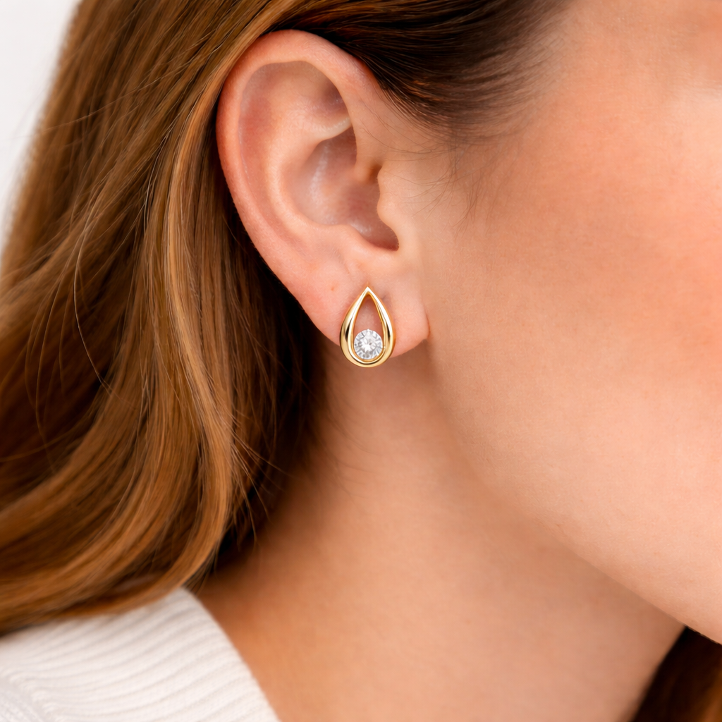 O design delicado dos brincos banhados a ouro 18k valoriza o rosto com leveza e brilho suave, ideal para composições versáteis no dia a dia.