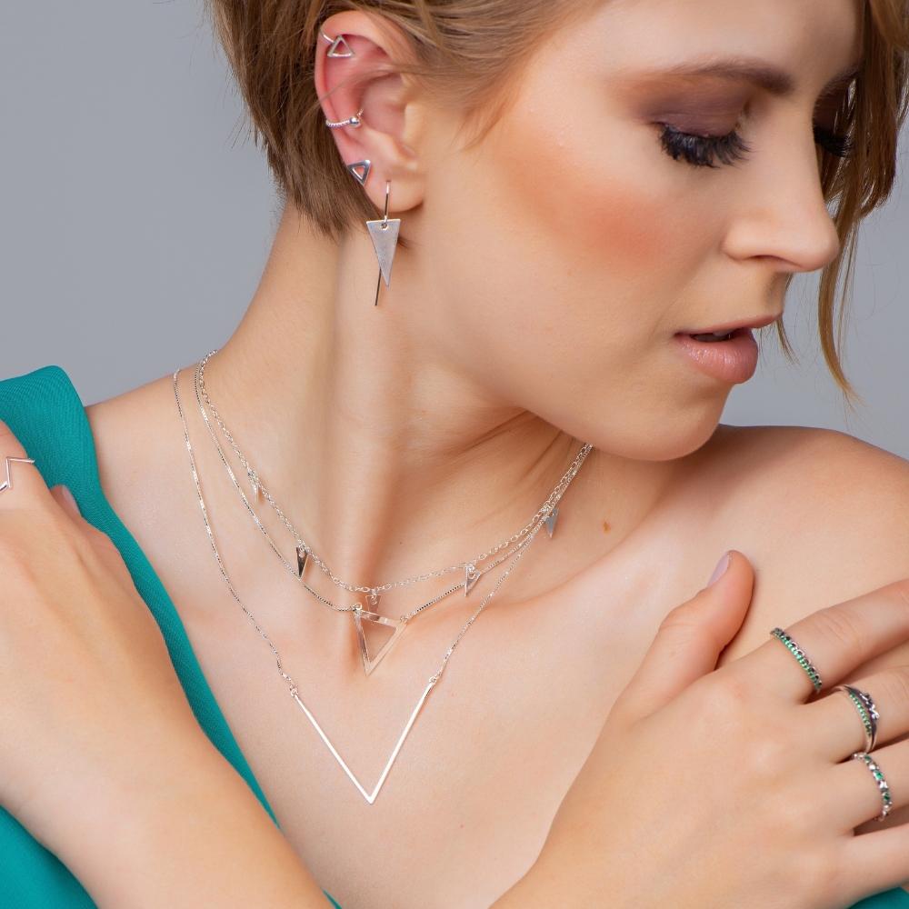 O colar V geométrico em prata, é simplesmente incrível, graças ao seu design geométrico, que nunca sai de moda!