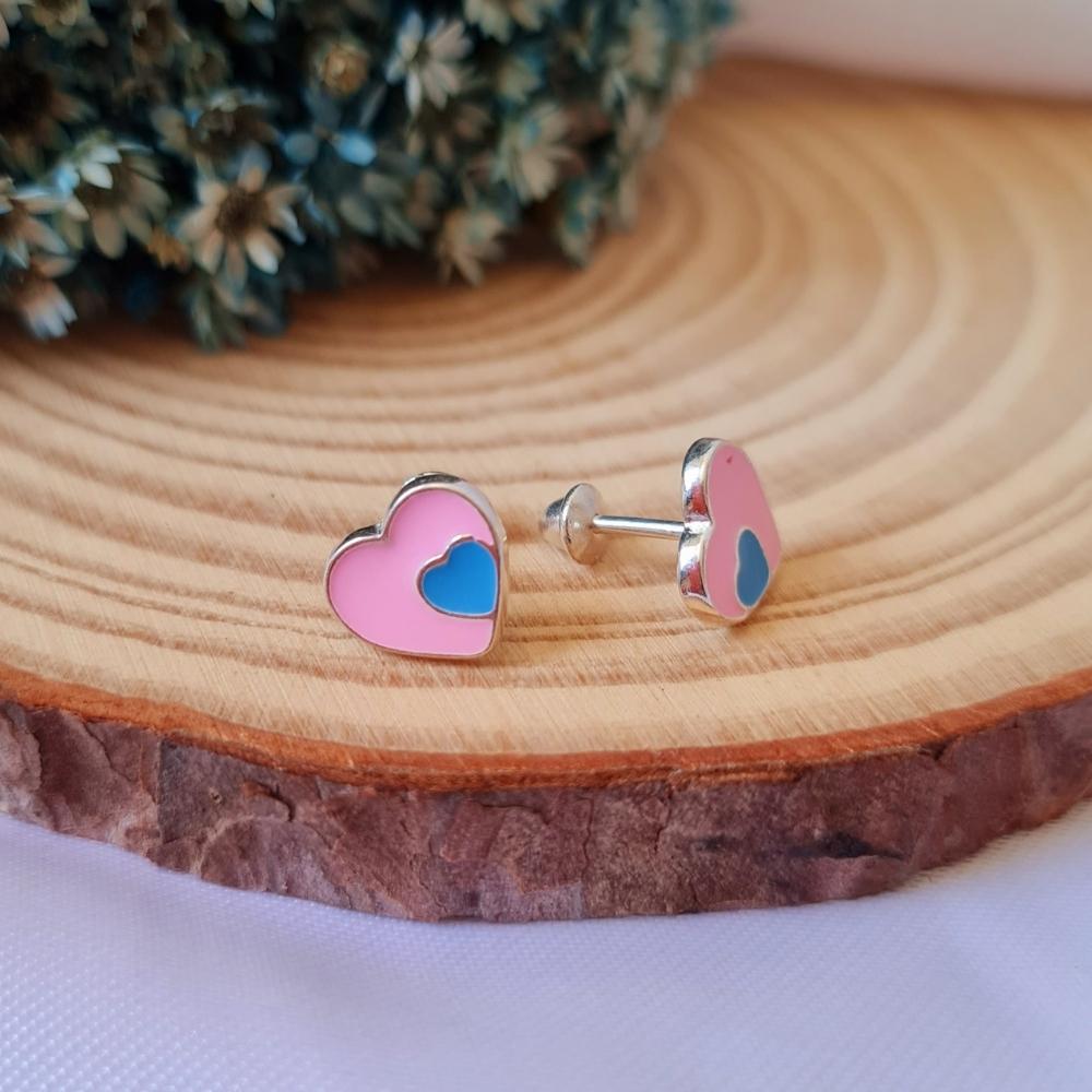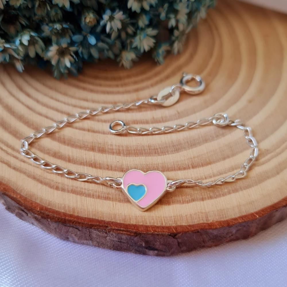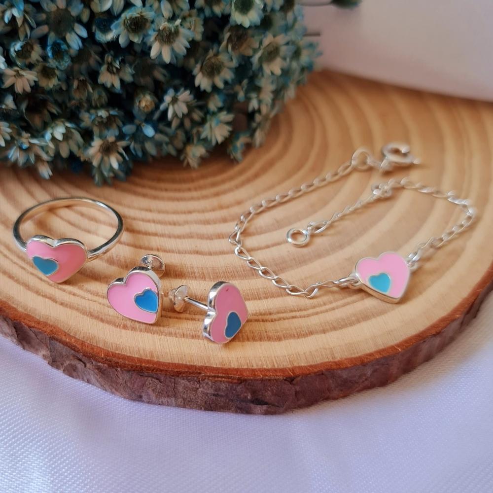 Conjunto de prata infantil coração rosa com azul