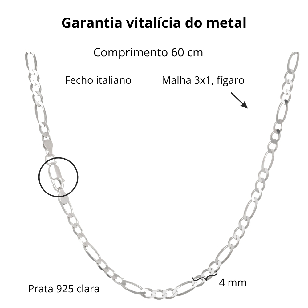 Feita com elos 3×1, também conhecidos como Fígaro, essa corrente de prata lisa garante um visual marcante e moderno. O fecho italiano proporciona segurança extra, ideal para o uso diário.