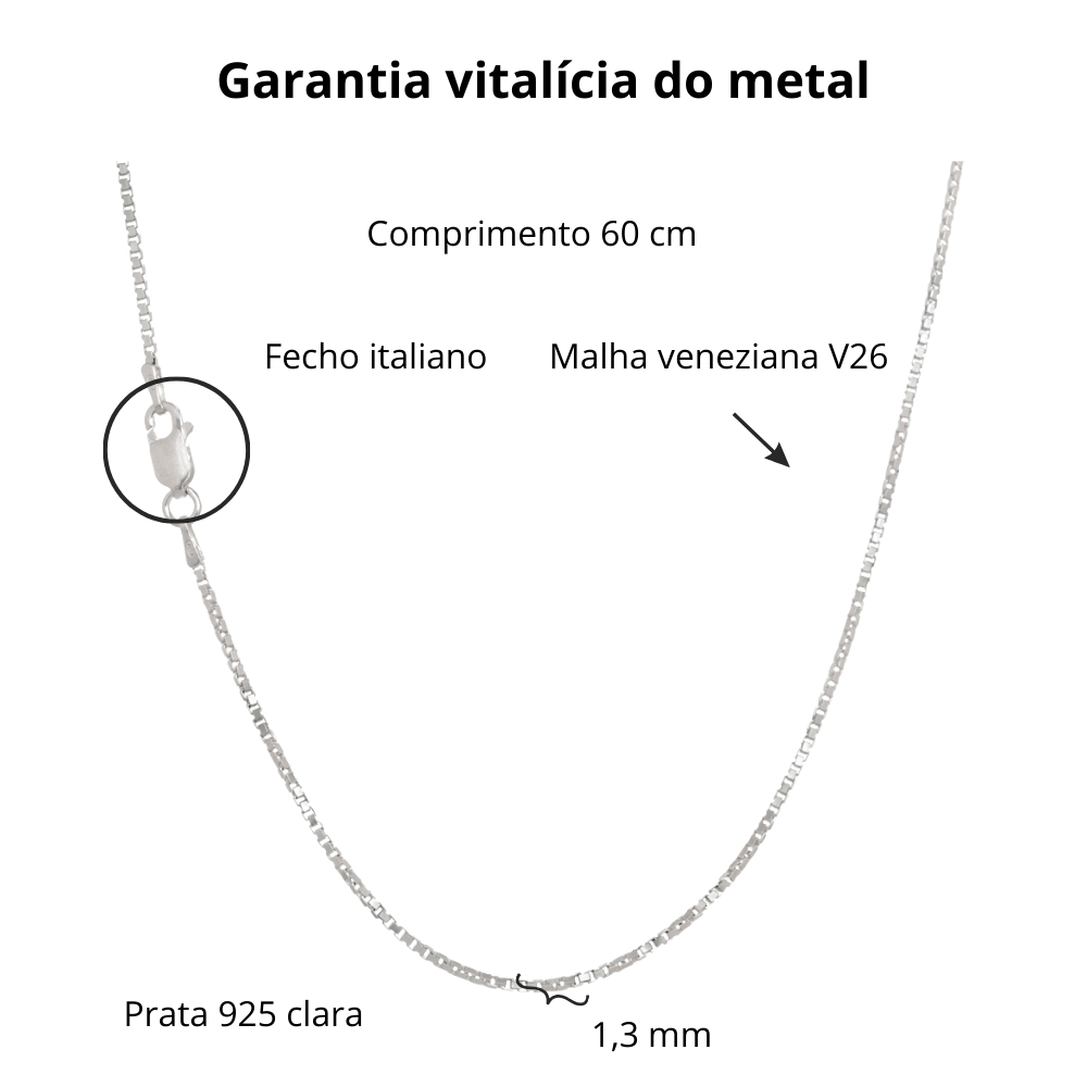 Feita com fio 0,26 na malha veneziana, possui 1,3mm de largura, ideal para um visual discreto e elegante. O fecho italiano proporciona segurança e praticidade no uso diário.