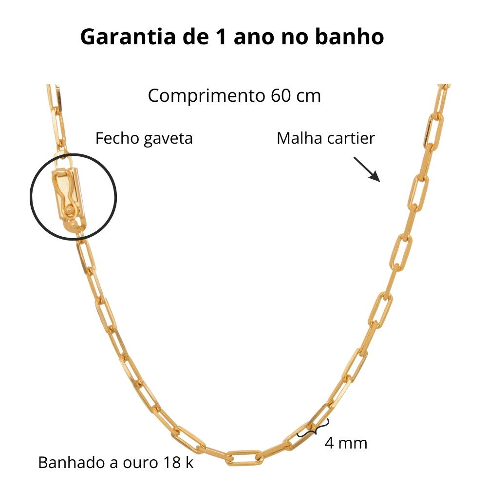 Com 60 cm de comprimento e 4mm de largura, essa corrente apresenta um design sofisticado na malha Cartier. O fecho gaveta, além de estiloso, oferece máxima segurança durante o uso.