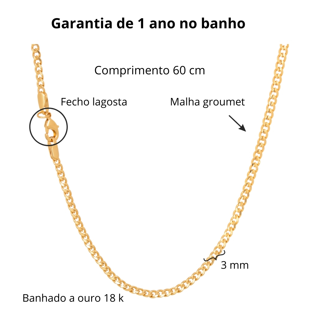 Feita no elo Groumet, ela tem 60 cm de comprimento, 3 mm de largura e fecho lagosta, combinando estilo e segurança para o uso diário.