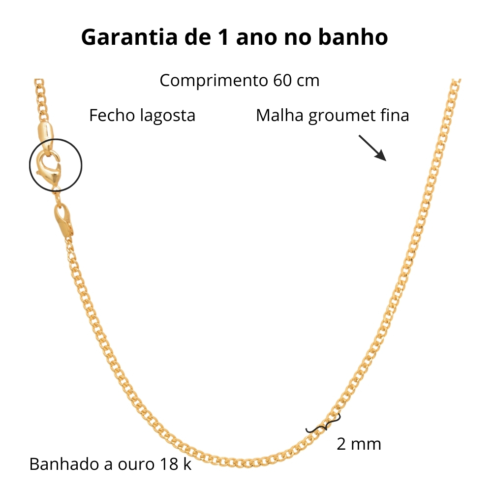 Feita no elo Groumet, ela tem 60 cm de comprimento, 2 mm de largura e fecho lagosta, combinando estilo e segurança para o uso diário.