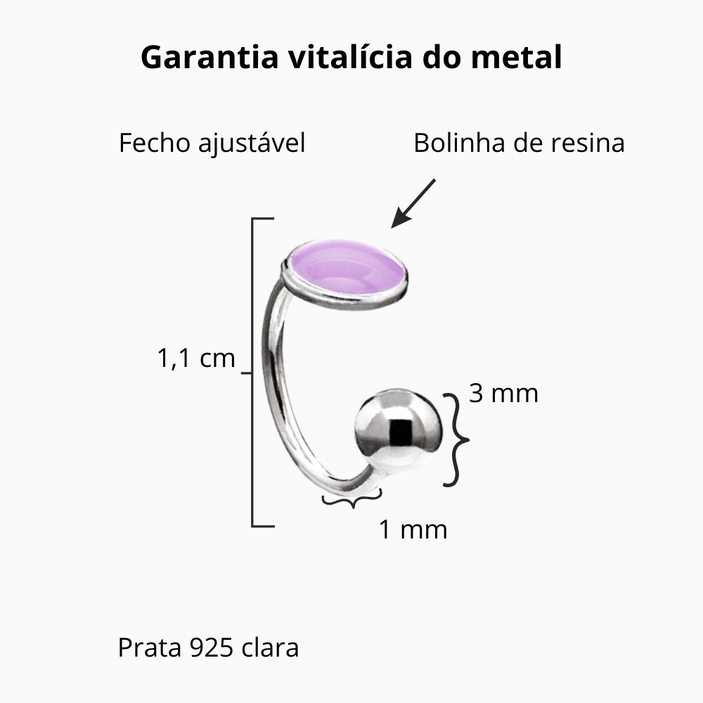 Além da aplicação de resina, o piercing de pressão bolinha lilás tem uma bolinha em prata lisa.