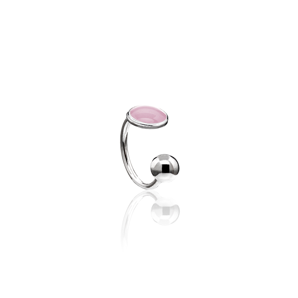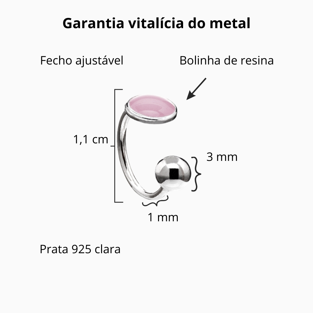 Além da aplicação de resina, o piercing de pressão bolinha rosa tem uma bolinha em prata lisa.