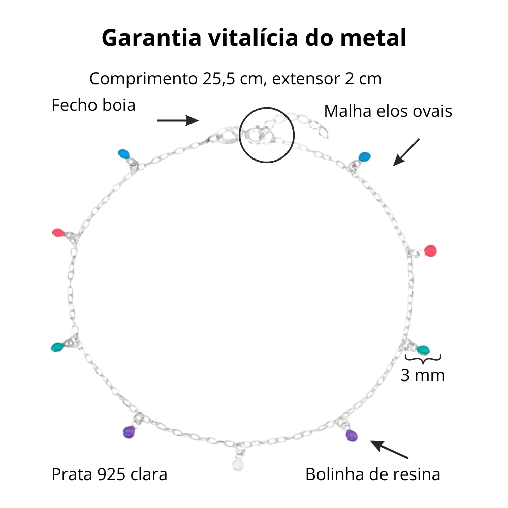 Além disso, a tornozeleira de prata colorida é perfeita para quem gosta das tendências de acessórios delicados e minimalista.